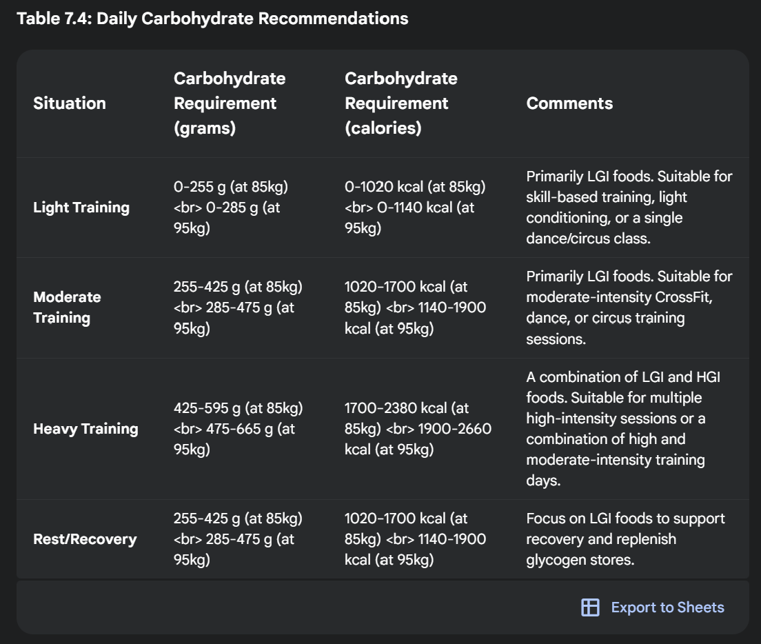 Now I could account for performance and such but that’s a future that hasn’t happened yet. Instead, let’s account for variation of carbohydrate requirements in training. We have a mixture of moderate, moderate high, and high intensity activities. All of these will vary depending on training days and how many sessions are done per day.